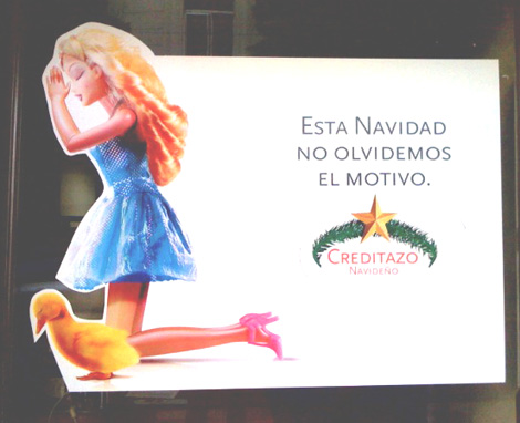 No sé a ustedes, pero a mi me dejó helada al ver la campaña publicitaria navideña de un Banco. El otro día caminando por la calle me topo con éste cartel y no pude evitar sacarle una foto…será que el no ver tele me tiene un poco ajena y sensible a la violenta invasión publicitaria navideña?, pero yo creo que es esa mezcla de Barbie- rezando- de rodillas- por más plata para Comprar! … habría que preguntarle a un publicista si es tan buena campaña y efectiva.